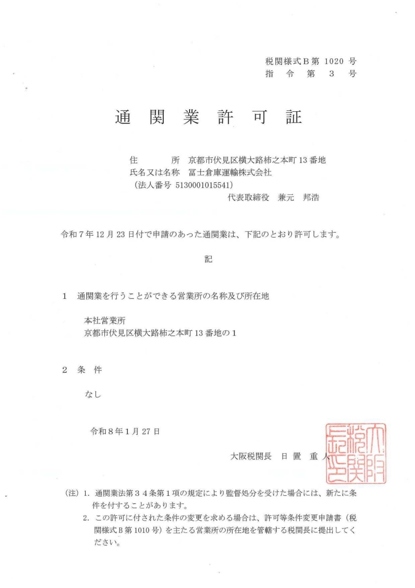 冨士倉庫運輸株式会社は、このたび通関業の事業免許を取得いたしましたので、お知らせ申し上げます。